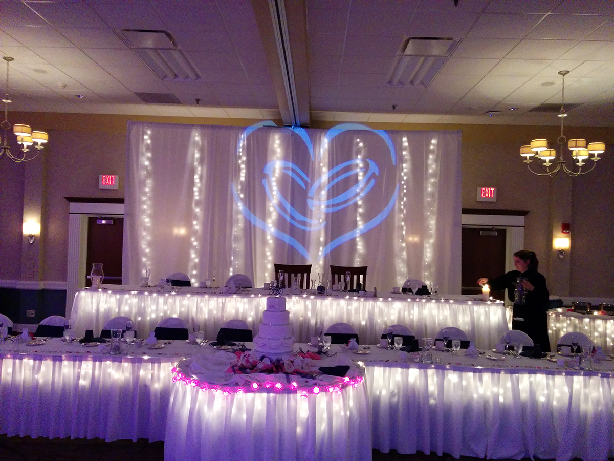 Lighted graphic above head table between the bride and groom